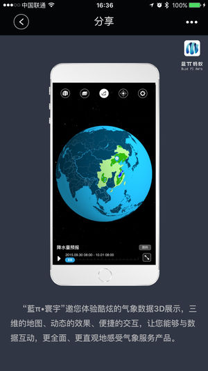 “蓝PI•寰宇”,寰宇赋予整个宇宙、整个空间、整个天下之意,是专业的气象数据立体化展示系统,应用自身技术上的优势实现专业气象服务产品在3D地球上的展示! 酷炫的三维地图、华丽的动态效果、简洁的界面设计、便捷的交互操作都为产品注入无限生命力,趣味十足,让您在指尖轻触间,更全面、更直观地感受专业气象服务产品。候君多时,请您快来体验吧~~惊艳、新颖、酷炫、个性、狂拽、独特、美妙@π∮$%&§£¥¢¤#Ð~~~ 功能特色: – 专业气象服务产品展示:全国降水量/强对流天气/空气污染气象条件/雾区/霾区等预报、天气统计、雷达图、卫星云图、天气网眼等。 - 全新人机交互操作体验:界面简洁易懂、操作通顺…