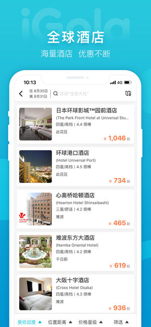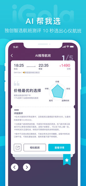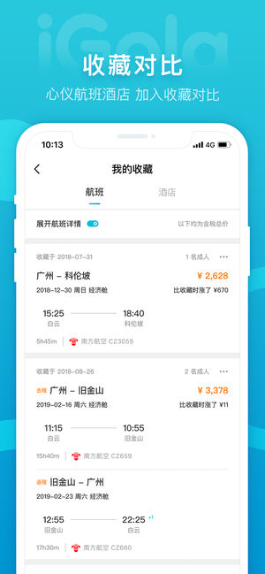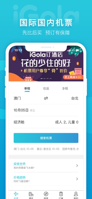 iGola专注于国际机票的比价和辅助预订,提倡”聪明的旅行者,先比后买“,可实时比较全球航空公司和多个OTA的航班组合及机票价格。有了iGola, 机票再也不怕买贵了。iGola提供全球酒店预订,飞去哪,住在哪,贴心为您全程服务。 【功能介绍】 • 一键机票搜索:支持全球上百家航空公司的国内机票、国际机票搜索,同时可极速比对亚洲、欧洲、美洲等目的地的航班组合。 • 丰富航班选择:无论是单程预订还是往返程,支持使用价格、中转数、飞行时长、航空公司、机场等多种条件筛选。 • 何时飞:专为已选定目的地的飞行客准备。支持一键搜索与目的地之间的最高性价比出行时间,助你预订从中国出发的更低价国际机票…