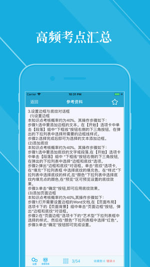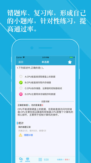 本软件为全国计算机等级考试二级Ms Office 高级应用考试的软件,精心准备了2018年最新考试题库。包括【专项练习】、【历年真题】、【最新全真押题】含答案详解。适合全国计算机等级考试及各省计算机等级考试,为考试的提供了充分的复习准备,可随时随地学习练习,有效帮助顺利通过考试,学习知识通过考试必备神器! 【功能介绍】 1、题库:【专项练习】、【历年真题】、【最新全真押题】,并有答案解析。 2、考点汇总:含复习的考点汇总。 3、错题库:可自动加练习过程中错题加入收藏,以便反复练习。 4、收藏夹:可在练习过程中自行收录题目到收藏夹,形成自己的小题库,针对性练习,提高通过率。 5、可通…
