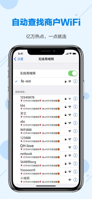 WiFi万能密码:您的随身Wi-Fi管家. 智能查询身边Wi-Fi热点数据,一链连接快速上网! =========功能特色========== - 全国亿万热点,随时随地一键连接 亿万用户共享,全国2亿热点一点就连 - 千万运营商Wi-Fi任性连 我们买单,您上网,已支持中国移动CMCC-WEB、中国电信ChinaNet。 - 安全上网,智能检测 自动智能检测WiFi安全,提供安全可靠的上网体验 我们所做的一切,只为给您带来方便,快速的上网体验! WiFi万能密码,亿万用户的口袋WiFi! 官方QQ交流群:175272140