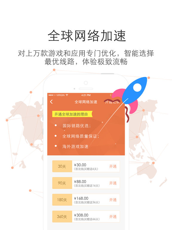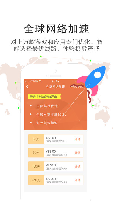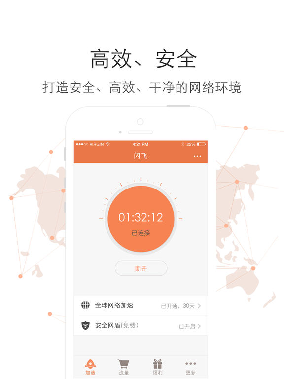 闪飞(sFly) ,是一款上网辅助神器,加速全球网络! 闪飞(sFly) 采用应用层加速技术,连通400多台高速BGP服务器,实现免费WiFi、2G、3G、LTE网络加速。保证数据传输稳定,提升下载速度,增加视频缓存流畅性,是您办公、娱乐、出差、旅游的好助手! 【网络加速】 视频加速器,游戏加速器,下载加速器,云盘加速器,网页加速器,网站加速器。浏览App Store、Apple Store、iCloud、iTunes、Slack等速度明显提升。优化财说等财经软件使用体验。访问美国亚马逊、日本乐天等网站速度更快。国际使用微信、QQ等即时通讯不卡顿,语音视频更流畅。 【安全网盾】 智能识别网站风险、木马、钓鱼,有效杜绝风险网站侵扰,保护您的账户、财产安全。