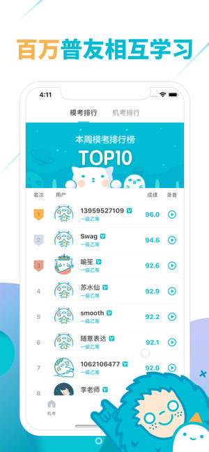 1.预估考试成绩 根据《普通话水平测试》规范,分别进行单音节字,多音节词语,文章朗读进行普通话发音打分,估算考试成绩。 2.针对性发音练习 每套测试均附带拼音与专业音频练习,可录制自己音频对比进行提升,确定薄弱的专题模块,为后续的普通话水平提升做好准备 3.丰富的普通话考试素材: 配合兄弟软件普通话学习,内含测试用6595个词语,60篇朗读,30篇命题说话范文,附带标准音频。不再怕读不准拼音字母表、普通话发音,拿甲等就是可以这么简单! 4.优质的产品体验 小到每个按钮的每个动作,大到软件的整体布局,无论是交互设计还是产品功能,都经过数万次的测试,努力做到大家满意的产品。 有了普通话测试…