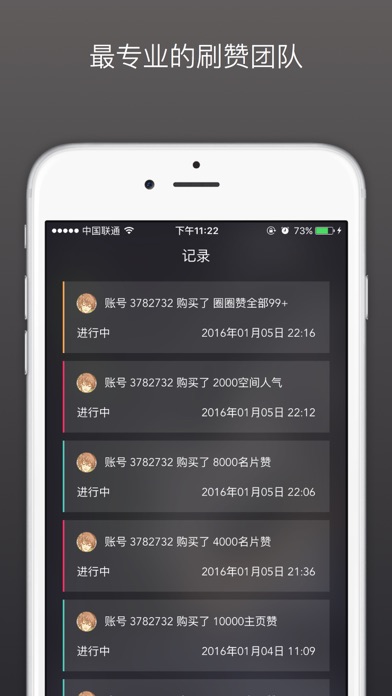 最专业的刷赞团队,快速增加你的个人QQ名片赞、空间人气、说说赞、厘米秀鲜花和空间主页赞 还在担忧自己人气不足,羡慕别人的高人气?这款应用将让你瞬间变成人气王!拉爆标签赞,无敌访问量,你就是人群中的super star! 只需要绑定你的个人QQ号,然后选择购买的刷赞类型和数量,我们就将开始为你点赞,操作简单快捷,多年的稳定刷赞服务让您放心