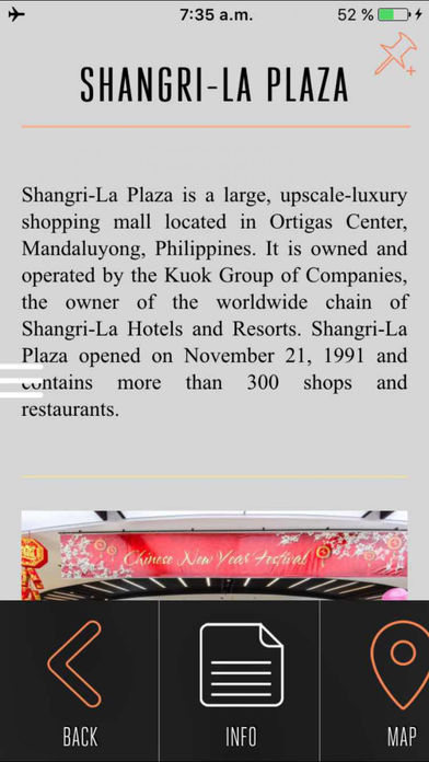 Tourist guide with detailed official info about Shopping in Manila. We have developed this tour guide based on visitors advice and experiences. Mobile guide 100% offline developed for all those travellers willing to discover these great places. Containing: - Introduction - Areas for Shopping - Cash & Credit - Public Market - Ukay Ukay - Robinsons Place Manila - Ortigas Center - Shangri-La Plaza - SM Megamall - Ayala Center - Greenbelt - Glorietta - Bonifacio Global City - Market! Market! - Alabang Town Center - Festival Supermall - Gateway Mall - TriNoma - Rockwell Center - SM Aura Premier - SM City Manila - SM Mall of Asia - SM City North EDSA - Practical Information - Maps - Access to a complete Travel Guide of the city of Manila with public transportation, zoomable street maps 100% offline and daily itineraries to spend the most of your time visiting this magnificent city. Get the most out of your visit!! You can always reach us at contact@etips.com