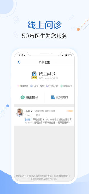 泰康医生APP,您的掌中家庭医生。最便捷的专业问医、最智能的健康记录、最贴心的健康指导、最尊贵的专家绿通,基于全国覆盖的医疗健康网络及医生集团,综合运用“大物移云”技术,提供可靠、可及、个性化的医疗健康服务,让您更健康、更长寿。