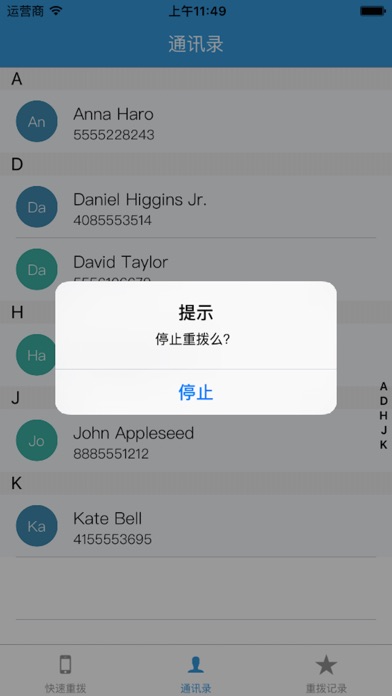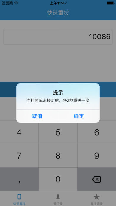 重拨助手,是一款便捷的拨号辅助APP。再也不用担心老婆、老公、女友、男友不接电话啦。 1、重拨功能,外拨电话结束后,会自动继续重新拨打5次,可手动停止或者5次自动停止。 2、自动发送按键查询本机话费,操作流程:以福建地区为例,使用本软件呼叫‘10086,,1即可;解释:呼叫10086,通话后,等待2秒,发送1按键。