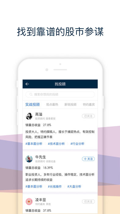 有看投APP 是第一财经旗下集投资咨询、社交和资讯为一体的互联网投资服务平台,平台依托第一财经的资源,汇聚百家金融证券投资理财服务机构、上千投资理财顾问及投资达人,通过“点金”“锦囊”等多种服务模式,为广大个人投资者提供个性化的分析和建议,以提升投资水平。同时,第一财经为平台提供了专业的内容生产和审核团队,全方位把控内容和质量。 在有看投,您可以 (1)参加模拟炒股大赛:和专业的投资顾问以及民间达人同场PK,晒出您的收益,证明自己的实力。 (2)观看交流投资观点:专业投顾和投资达人第一时间发布自己对市场的观察和分析,以及专业的研究观点,您可以关注他们,也可以与他们交流互动。 (3)锦囊观摩:每一位投资顾问和炒股达人,都有着自己的选股策略,择时方法以及风险控制的技巧,锦囊通过让普通用户同步观察锦囊管理者的操作,学习和交流面对瞬息万变的市场,如何更从容专业的应对。 (4)收看节目:第一财经电视包括《今日股市》《谈股论金》《公司与行业》等王牌证券类节目和多档新锐互联网独家自制栏目在有看投上全景呈现,用户可以同步收看直播或自由点播。