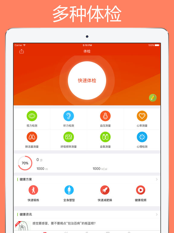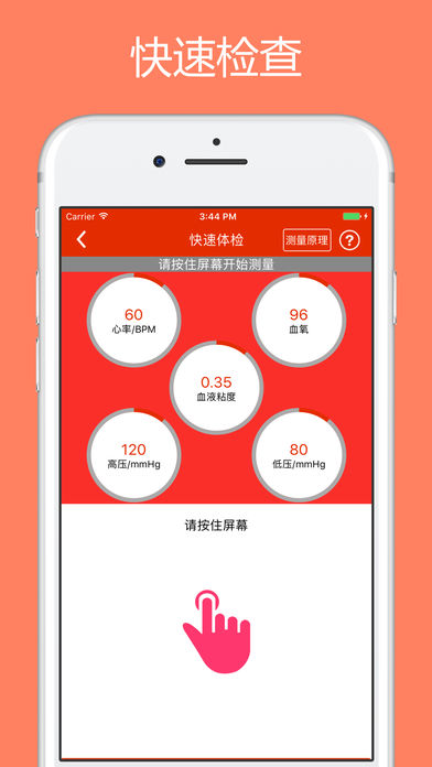 体检宝-手机测量血压、视力、心率、情绪 无需任何外设,体检宝直接用手机测量用户的血压、心率、视力、听力、肺活量、心理指数、色盲等身体数据,并提供有针对性的可交互的健康方案。 【世界首款血压测量APP】 【世界首款血脂测量APP】 【国内首款心率测量APP】 【世界首款脉搏波采集分析软件】 【世界功能最多的体检APP】 使用方法: 1. 用手指按着屏幕. 2. 轻轻地把食指轻轻放在手机背面的摄像头上,确保摄像头被完全覆盖. 3. 保持住这个姿势直到测试完成. 4. 手指不必按着闪光灯,按着闪光灯手指可能会发烫. 【数据可靠】 通过大量的用户验证: 1.心率误差在 正负3以内 2.血压对95%以上用户,误差在正负12以内 3.血氧误差在 正负2以内 4.高血脂的识别度和准确度80%以上 使用注意事项: 1. 请允许APP打开使用摄像头 2. 如果当前设备没有闪光灯,您可以在 阳光下 或 灯光下 等光线比较好的地方测量 【功能介绍】 体检宝通过手机测量、可穿戴设备来收集和汇总用户的健康信息,为其提供个性化的健康解决方案(饮食、运动)和健康风险评估,为存在健康隐患的用户接入第三方服务。 主要有以下功能: 1. 通过手机测量用户的血压、心率、视力、听力、肺活量、心理指数、色盲等身体数据。 2. 统计用户每天的健康数据,给出统计和趋势分析。 3. 基于用户的健康数据及其健康数据的变化趋势,给用户提供健康警报服务。 4. 无需穿戴设备,超便捷计步。 5. 七分钟锻炼、眼保健操、减肥操等各种游戏化的交互式训练方案,统计管理每天的运动量和运动类型。 6.支持“健康”应用,将测量结果记录到“健康”应用,方便监测您的健康数据。 警告: 这不是一种医疗产品。不适用于医疗用途,仅用于健身。 ------------------- 升级到Premium以使用高级功能,你可以添加注释到您的健康数据,根据条件筛选数据,导出您的健康数据,计算你的目标心率区间、 更有效的训练计划等。 你可以选择高级功能的订阅持续时间-订阅 1 个月或订阅 1 年。 1 个月订阅价格-$3.49; 1 年期订阅价格-$24.49; 自动更新的订阅会默认直接续订,直到用户取消订阅。 http://www.xueyazhushou.com/statement.htm