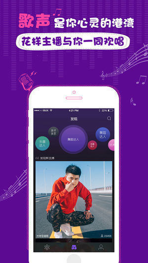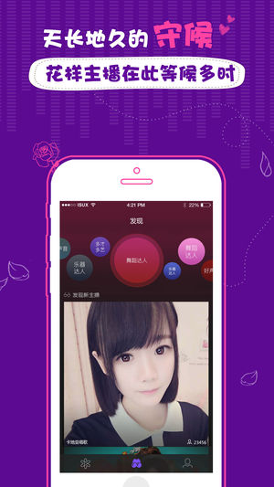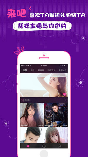 快来花样直播为才艺主播打call 【汇聚海量主播】 汇聚海量多才多艺的主播,拿出手机就能看到好声音主播、乐器主播、舞蹈主播,7 X 24小时不间断直播,总能找到你喜欢的。 【丰富的娱乐内容】 在这里有多样化的娱乐休闲直播内容,既可沉浸其中听音乐,又可与主播闲聊找乐子,还有脱口秀直播等着你。