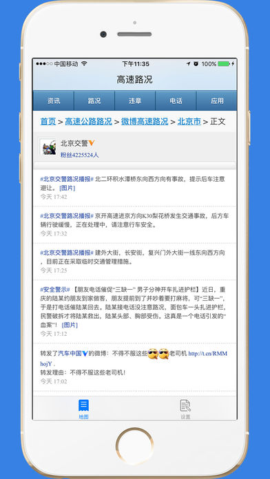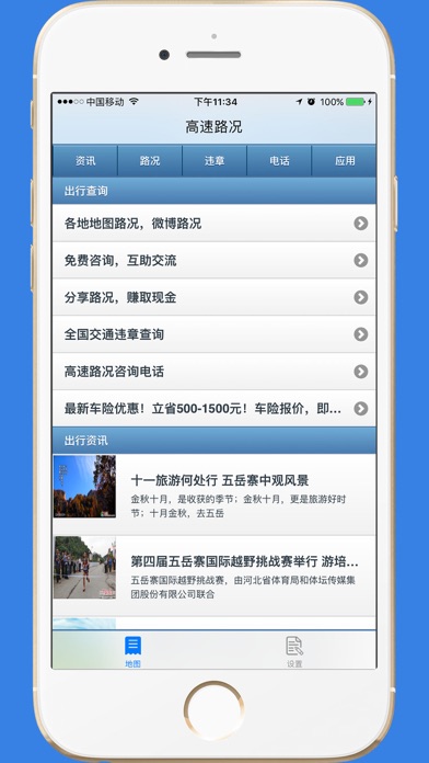 【产品简介】 这是一款全国高速路网实时路况查询的的APP,可以根据不同城市作为入口查询地图上的路况,也可以查到全国高速公路的咨询电话,还可以免费查询全国车辆的违章。 【特色功能】 1.查询全国高速路的实时路况信息。 2.查询全国高速公路的咨询和报警电话。 3.免费查询全国车辆的违章功能。 4.实时路况资讯 【官方微博】 http://weibo.com/cnmaps 【意见反馈】 cnmaps@qq.com