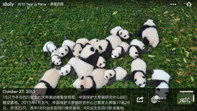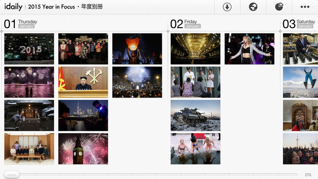 每一天,我们从全球超过 30000 张新闻图片中选出最能够拓展视野、打动人心的镜头记录。一年 365 天,你所看到的「iDaily · 2015 年度别册」即是这 1000 万张新闻图片中最出色的 3000 个画面,3000 个瞬间。 我们试图从这些照片中找到人类对世界的定义,呈现超越时空的价值,为未来者讲述我们所身处此刻的文明。 「iDaily · 每日环球视野」2015 年度别册,用三千张全球最顶尖的新闻图片,与你一同重温这颗星球上人类文明的 2015 年。 =特别亮点= 1.超越极限的视觉体验:3000px 超高清晰图片 2.时间轴:365 天,纵览全球事件 3.背景阅读:维基百科…