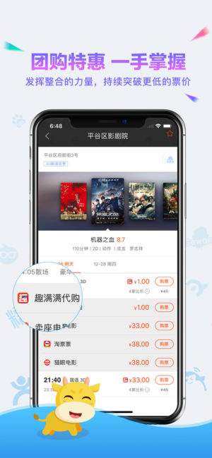 趣满满,年轻人都在用的电影票购票app 巨省钱,所有渠道优惠补贴都不错过 ◆猫眼,糯米,淘票票,娱票,格瓦拉,卖座,大众点评多渠道比价 ◆趣满满代购,黄牛票的价格,在线选座的体验 ◆黄金座预留,好的位子别人无,这里有 ◆村里的影院都支持,共支持影院数量8000+家 ◆丰富的电影资讯,新的电影排期,剧照,预告片、影评全都有 ◆电影弹幕吐槽,不吐不快,先吐为快 即将上映的热门电影 《李茶的姑妈》开心麻花又一力作 《无双》周润发、郭富城造假双雄“钞友情” 《影》张艺谋导演,邓超孙俪同框飙戏 ———————————————————— 【联系我们】 技术支持QQ群:165756219(已满) 487…