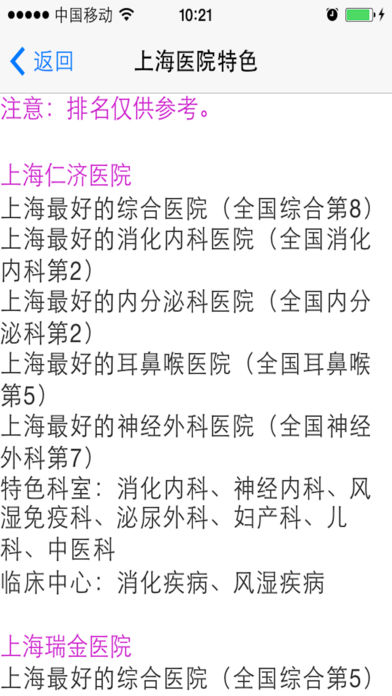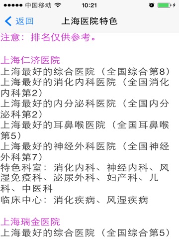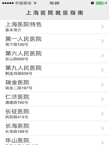 Hospitals SH v1.0 Information of hospitals in Shanghai including website, contact phone, reserve methods and traffic etc. 上海就医v1.0 包括上海主要医院的特色简介,医院的网址,联系电话,预约方式,以及交通信息等。 所整理的信息,仅供参考。若需要最新、实时的信息,建议访问医院官网或电话咨询。