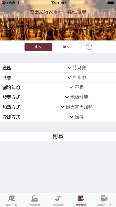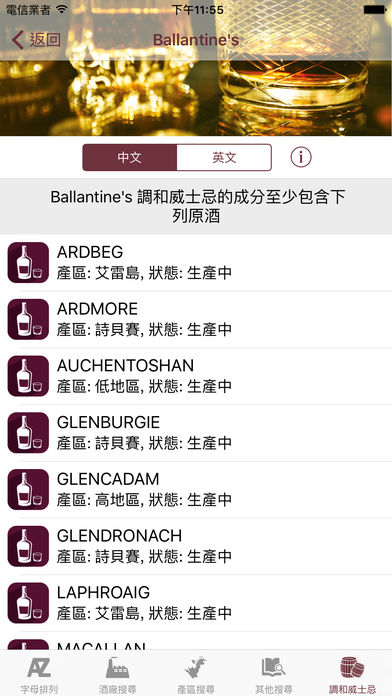 《威士忌行家手冊:蘇格蘭》含有上千頁的資訊,揭露所有蘇格蘭威士忌酒廠的技術亮點,並解開了各家威士忌的風味秘密。 你知道你所喜愛的威士忌在製作過程當中所採用的水源、麥種、發芽方式、蒸餾方式嗎?你知道你最愛的酒廠的蒸餾器大小、蒸餾器形狀、蒸餾時所取酒心的參數嗎?一百多家現役蘇格蘭威士忌酒廠的這些資訊,全都記載於這個應用程序內。是行家絕對要擁有的參考手冊,也是入門者想要一窺威士忌殿堂的必備百科! 產品特點: 1)揭露一百多家現役蘇格蘭威士忌酒廠技術亮點 2)包含七百多家已關廠蘇格蘭威士忌酒廠的基本資訊 3)提供上百家調和威士忌的內含原酒資訊 4)可依照產區、發芽方式、加熱方式、冷卻方式進行快速搜尋 5)所有資訊皆有中英雙語顯示 6)可離線使用 技術資訊包括: 產區、其他名稱、創始人、創始年份、水源、麥種、發芽方式、發芽廠資訊、糖化時間、發酵時間、發酵後酒精度、加熱方式、第一段蒸餾器資訊、初餾酒精度、第二段蒸餾器資訊、林恩臂角度、新酒酒精度、冷卻方式、入桶酒精度、年產量,及更多資訊。 擁有這個應用程序,你也將是威士忌行家!隨時隨地可以查詢任何酒廠的資訊,是學習威士忌以及購買威士忌的最佳導師,任何威士忌隨查隨懂,風味及技術亮點即可信手拈來!
