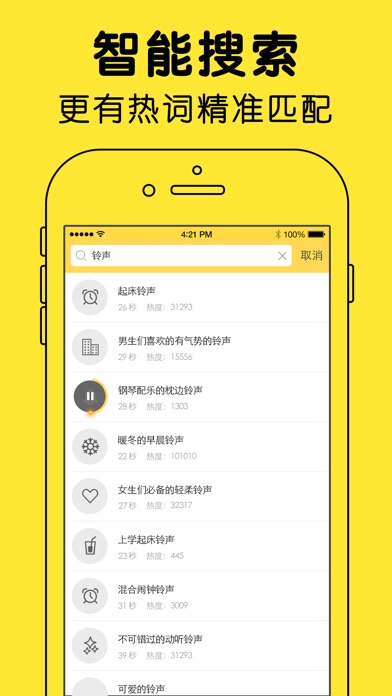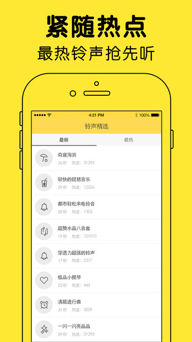 超过300,000首高品质铃声,真正的海量铃声全球首发 天天更新,首首精彩,专属铃声随心淘,再也不用担心跟别人撞铃了 功能简介: 1、最全的高品质铃声库,海量铃声任你选 2、紧随热点,时下最火的歌曲铃声,全都不会错过 3、 影视、轻音乐、动漫、搞笑等各类铃声随你挑 4、每天实时更新,最新铃声抢先听 5、最全分类,清晰明确,保证您可以快速定位自己的爱好,找到自己想要的那一首 6、智能搜索功能,更有热词精准匹配 7、轻轻一点,快速试听 8、问题反馈功能,有问题或建议欢迎随时反馈 此乃打造您专属爱机的必备应用,千万不要错过哦!