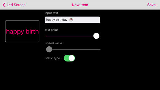 LED 可以用来当做iPhone/iPad上的滚动字幕,你总有时刻需要它,不如现在就入手吧! 接机时通过滚动屏迅速找到接机人,节日时用来庆祝调节气氛,比赛时为选手队员助威,向喜欢的人表达你的爱意,演唱会时亮出你的“招牌”。更多使用场景等你来玩。 ~ 可以随意设置字体颜色 ~ 可以设置字体滚动速度 ~ 可以静态显示/循环播放 ~ 不卡屏,不花眼,好玩! 简洁但不简单 1.1 没有多余的功能,只为让你制作出趋于完美的效果 1.2 界面简洁,符合系统风格,适用于多种场合 小巧又稳定 2.1 占用空间小,不浪费系统内存资源 2.2 不卡顿,零闪退,只为让你用得放心 感谢使用本软件,如果您对软件有什么建议或意见,欢迎提出,我们会根据使用者的反馈持续更新和添加新功能。 联系邮箱:3218499178@qq.com