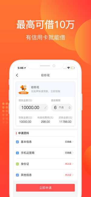 给你花致力于打造“年轻人的信用钱包”,为您提供纯线上、无抵押、最高10万额度的借款申请服务。 【产品特色】 √ 额度灵活:5000-10万额度轻松借。 √ 授信神速:3分钟申请,快至2小时到账。 √ 借款简单:线上审核,有信用卡就能申请,无需任何抵押。 √ 安全可靠:专业团队,合法合规,承诺保护隐私。 √ 信贷资讯:信用卡、贷款讯息,随时掌控。 【关于给你花】 给你花上线以来,已经累计为2500万+用户提供了快捷的移动金融服务,业务覆盖全国。 母公司“51信用卡管家”2016年9月完成的3.94亿美元融资额创下了互金行业C轮融资纪录,融资后公司估值超10亿美元,跻身独角兽行列。公司荣膺福…