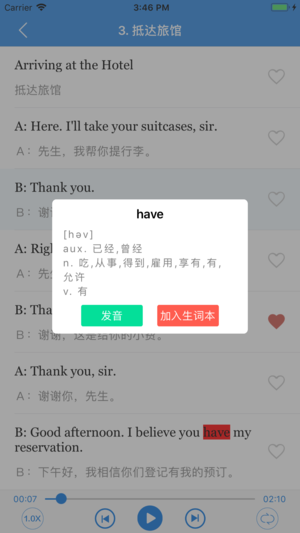 旅游英语包含了出国旅游所涉及的机场、签证、住宿、吃饭、娱乐、观光、购物、租车、生病、报警、退房等方方面面的英语口语,无需联网、即点即播,方便使用,是您出国旅游必备软件! 功能介绍: 支持循环/单篇/单句播放; 长按单词即可查询词义及发音; 在线英汉互译; 支持睡眠定时; 支持文字大小调节,自动播放等特色功能; 感谢大家的支持,欢迎多提宝贵意见,我们会不断完善!