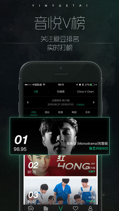 内容提要: 音悦台—全国最大的高清音乐MV分享平台。 我们“专注音乐,用心服务”,为粉丝,音乐爱好者打造完美舒适的用户体验,期待与每一个爱音乐的“你”同行。 功能介绍: * 独家大咖首发让您第一时间看好音乐。 * 海量高清MV免费观看和下载。 * 音悦V榜,国内独一无二,最权威的音乐MV数据榜单。 * 个性化悦单,彰显个人独特音乐品位。 * 丰富的自制节目:音悦大来宾、STAR调查团…偶像另一面等你来了解。 * 粉丝聚焦:饭制、饭拍,粉丝家族的地盘。 暂支持中国大陆地区播放,海外用户下载请谨慎,给您造成的不便敬请谅解! 同时欢迎您加入音悦台IOS客户端官方QQ群:234126380 或者在新浪微博搜索音悦台,私信留言给我们,向我们建言献策,您宝贵的建议是我们前进的动力,您还在等什么,赶紧加入音悦台和我们互动吧。