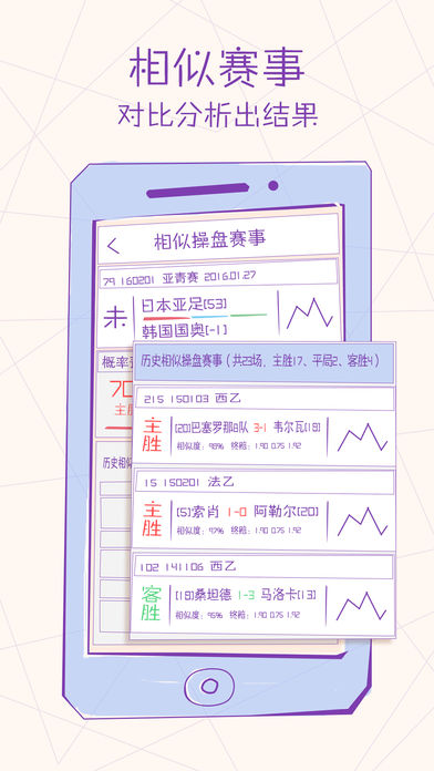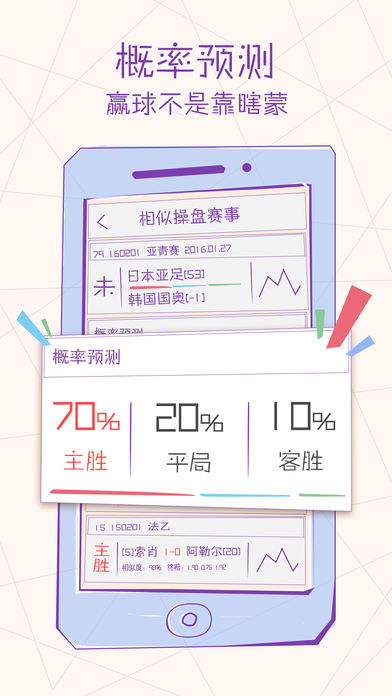 注意:本程序不支持iPhone4,对您有价值才进行购买,毕竟软件本身并不便宜。作者也提醒购买者摆正自己心态,从容面对得失,您的收获与付出成才能成正比。 足彩精准大师 - 足彩赛事相似操盘分析器,以独特的视角,基于近六万场北京单场与竞彩足球比赛赛事,为足彩比赛提供大数据概率分析。并在欧赔变化与概率预测方向差别较大时进行预警。同时使用它您可以用来进行盘口学习,掌握某一盘口所有的开盘历史及其方式,未来尽在您掌中。足彩精准大师,有态度的足彩分析器,大数据时代,足彩精准大师邀您一起来见证数据的魔力。 特点 - 基于大数据计算的联赛、球队主客场躁动因子 - 共165个联赛和杯赛数据可选 - 共58547场比赛可查询 - 共168819条操盘记录 - 共304485条欧赔记录 - 基于联赛因子、操盘过程相似性预测算法预测比赛结果概率 - 欧赔变化与概率预测方向差别较大时进行预警