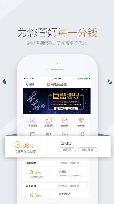 电e宝是集公共事业交费、电力在线服务、金融交易服务于一体的民生服务云平台,服务全国上亿用户,给您的生活充满电! 【一站式智能交费】 1、电费代收代扣 提供多种类、便捷、安全的支付方式,满足您全天候交费需求,给您提供全方位的电费支付体验! 2、电费小红包 可通过活动、碳能量兑换以及积分兑换等方式获赠电费小红包,抵扣等额电费,福利多多,快来参与! 3、电子账单 支持查询您每月的用电明细,也有趣味账单等新功能,为您提供更加人性化的查询体验! 4、碳生活 支持接入iphone健康数据(HealthKit),参与电e宝健康行走活动,还可以获得电费红包奖励哦! 【多场景金融理财】 1、活期理财 “活期宝”投资起点低,随用随取,支持高达500万元实时赎回;“交费盈”集“交费+理财”于一体,1分起投,带您分分钟赚取理财收益! 2、定期理财 各种不同投资周期的理财产品,到期自动赎回,满足您更加差异化的投资需求! 【增值服务】 1.光e宝 一键建光伏,打通线上线下,连接您与光伏,让您在环保的同时还能享受到源源不断的收益! 2.电商扶贫 以商业的方式扶贫济困,购买乡亲们的劳动果实,为远方辛苦的他们伸出援手,贡献一分爱心。