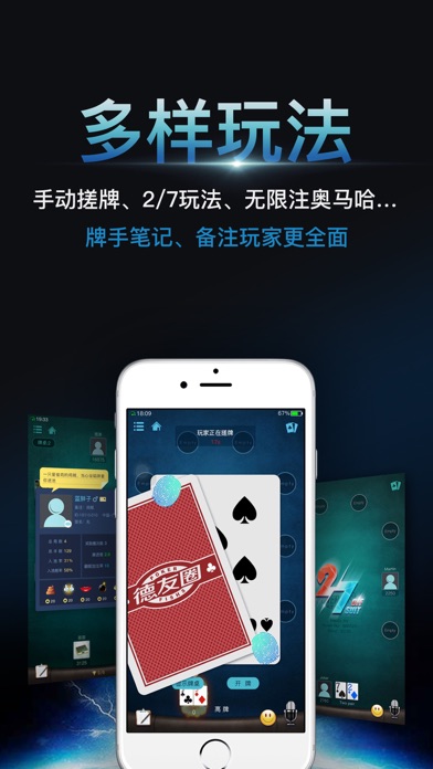 德友圈 - 以德汇友,只做最真实的德州体验! 方便快捷的德州扑克约局利器,提升德州扑克技巧,32项房间管理功能、10项个性化设置,多样比赛体验,安全、公平、专业的德州扑克社交软件,还原德州扑克竞技乐趣! 【完全模拟真实现场的保险系统】 — 主池大小、保险赔付额一目了然; — 购买多少张Outs自由选择; — 购买保险时,牌局内所有玩家都能看见,真正做到公平、公正、公开; — 保险赔付将直接进入本局后手; — 购买保险后落后的玩家可以选择搓牌; 【32项房间管理功能、10项个性化设置】 — 德州、奥马哈两个玩法随意选择; — 牌局人数2、6、8、9可供选择; — 牌局入局时计分牌最小带入设置; — 牌局入局时计分牌最大带入设置; — 牌局计分牌累计总带入设置,除非房主同意,否则累计计分牌数量不得超过设置上限; — 牌局Ante设置; — 牌局强制Straddle设置; — 牌局IP同桌限制,设置后相同IP的德友将不能同桌竞技; — 牌局GPS同桌限制,设置后GPS定位于同一地点的德友将不能同桌竞技; — 牌局2/7玩法设置,让牌局更刺激; — 可以在牌局进行中对每个玩家的总计分牌带入限制进行新的调整设置; — 可以暂停牌局; — 可以让某个玩家离桌围观; — 可以锁定房间不再进入新的玩家; — 可以在进行中让牌局延长时间; — 可以将胡闹的玩家踢出牌局; — 可以设定全牌局禁言; — 可以指定某个玩家禁言; — 牌局内可以自由Straddle; — 黑名单、陌生人拒绝加入牌局; — 横竖屏随时切换; — 免费延时给你更多思考空间; — 对任意玩家添加个人备注名; — 随时可以保位离桌; — 牌局中,中了四条及以上牌型自动提示; 更多…… 【专业的技术保障】 — 德友圈后台采用全球运用最广泛、安全、高效的服务器操作系统; — 德友圈客户端使用最先进3D引擎,是世界知名多平台综合型开发工具; — 德友圈采用最具影响力的RSA公钥加密算法,杜绝暴力破解; — 德友圈采用全服务器校验机制,杜绝一切作弊外挂 — 德友圈只会给客户端发送他自己的手牌数据,从机制上让看牌类外挂无计可施; 更多…… 【公平公开的洗发牌算法】 (1)合牌:将52张牌随机打乱顺序,合在一起视为牌库A (2)洗牌:在牌库A中,随机在第20-32张牌的位置,将牌分为牌组a和牌组b。从牌组a中随机取出底部1-3张牌放在一旁,视为新牌库B,接着从牌组b中随机取出底部1-3张牌,置于牌库B上方。重复此动作直至任意一组牌已全部放入牌库B中,然后将另一组牌放置于牌库B上方。此全部过程称为一次洗牌(cross card),洗牌过程将随机重复3-7次。完成所有动作后,形成新牌库C。 (3)切牌:在步骤2所得到的新牌库C中,随机选择一个位置P(2<=P<=51),在P处将牌分为两部分,接着将这两部分的牌位置颠倒(P和P后面的牌,位置前移;P前面的牌,位置后移),将这一过程称为一次切牌(switch card)。 (4)发手牌:步骤2和步骤3全部执行完毕后,视为洗牌完成。此时,扑克牌已完全随机排列,没有任何规律性。系统将从庄家下一位开始,按座次顺序,给每位玩家随机发出牌库中的一张牌,直到庄位玩家获得一张手牌;重复此步骤直到所有玩家都拥有两张手牌。 (5)发公牌:为了完全模拟真实的环境,在flop、turn、river发牌前,系统每次都会从剩余牌库中随机抽取一张牌,并将其废弃(削牌)。 德友圈完全模拟真实环境,系统发的任何一张牌,都是由系统临时随机产生,在牌局进行中,每一张牌都无法被提前预知、控制,保证游戏的绝对公平性。 更多……