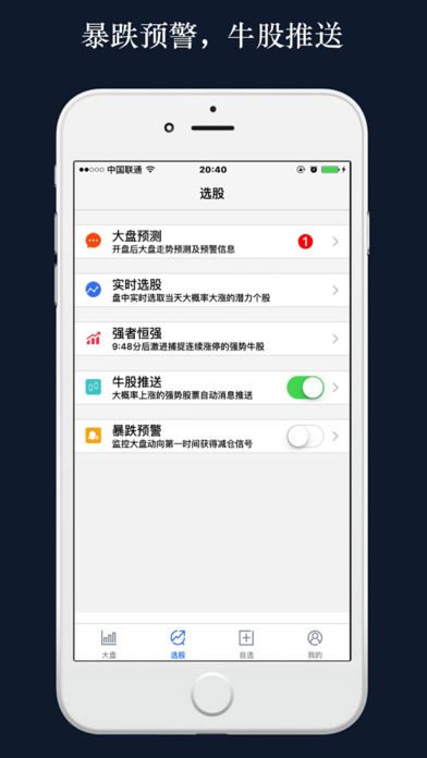 阿尔法狗炒股是一款智能的程序化行情和选股软件,后台利用大数据和有效算法,实时监控市场行情,精选大概率上涨个股,方便用户参考和决策。购买和问题咨询可加微信号:alphastock. 主要功能: (1 行情趋势 独到的行情数据指标,市场趋势预测一 了然 (2 实时选股 盘中实时选取当天大概率大涨的潜力个股 (3 强者恒强 捕捉连续涨停的强势牛股 (4 股灾预警 监控大盘动向,第一时间获得减仓信号 (5 牛股推送 大概率上涨的强势股票自动消息推送