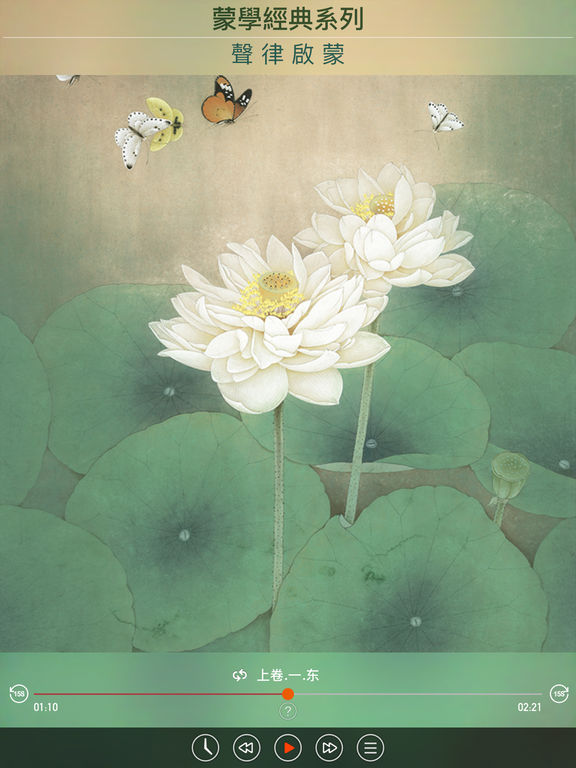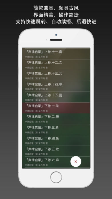 清代名士车万育作品《声律启蒙》,上下两卷,按韵分篇。 无广告,无内购。本地收听,无需联网下载声音文件。 支持后台播放、耳机控制、控制台操作、进度保存,支持滑动手势。 诗词和对联是中国古代重要的文学形式,两千多年来一直薪火相传,至今仍具有强大的生命力。在古代,自私塾的幼童起,就开始这种文学修养的训练,对声调、音律、格律等都有严格的要求。因此,一些声律方面的著作也应运而生,而其中清朝康熙年间车万育所作的《声律启蒙》,则是其中较有代表性的一种。 《声律启蒙》是训练儿童应对、掌握声韵格律的启蒙读物,分为上下卷。按韵分编,包罗天文、地理、花木、鸟兽、人物、器物等的虚实应对。从单字对到双字对,三字对、五字对、七字对到十一字对,声韵协调,琅琅上口,从中得到语音、词汇、修辞的训练。从单字到多字的层层属对,读起来,如唱歌般。较之其它全用三言、四言句式更见韵味。这类读物,在启蒙读物中独具一格,经久不衰。明清以来,如《训蒙骈句》、《笠翁对韵》等书,都是采用这种方式编写,并得以广泛流传。 作者:车万育(1632~1705年),字双亭,号鹤田,湖南邵阳人。康熙甲辰进士,官至兵科给事中。康熙二年(一六六三),与兄万备同举湖广乡试,明年成进士,选庶吉士。性刚直,直声震天下,至性纯笃,学问赅博。善书法,所藏明代墨迹最富,有萤照堂明代法书石刻十卷。 [收录内容] 01.上卷.一.东 02.上卷.二.冬 03.上卷.三.江 04.上卷.四.支 05.上卷.五.微 06.上卷.六.鱼 07.上卷.七.虞 08.上卷.八.齐 09.上卷.九.佳 10.上卷.十.灰 11.上卷.十一.真 12.上卷.十二.文 13.上卷.十三.元 14.上卷.十四.寒 15.上卷.十五.删 16.下卷.一.先 17.下卷.二.萧 18.下卷.三.肴 19.下卷.四.豪 20.下卷.五.歌 21.下卷.六.麻 22.下卷.七.阳 23.下卷.八.庚 24.下卷.九.青 25.下卷.十.蒸 26.下卷.十一.尤 27.下卷.十二.侵 28.下卷.十三.覃 29.下卷.十四.盐 30.下卷.十五.咸