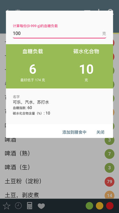 我的升糖指数和膳食负载助手是一款允许您浏览、搜索和显示不同食物的升糖指数的方便软件。另外您还可以查到食物的血糖负载和碳水化合物含量。了解食物的升糖指数,遵循低升糖指数饮食(比如Montignac, Paleo饮食)对降低患糖尿病、冠心病、与年龄有关的肌肉退化风险和与肥胖斗争都很有用。 本应用不包含广告。使用它无需注册或登录。所有数据都保存到设备上。祝您健康! 应用的主屏幕显示食物的三个列表,在里面您可以查到食物对应的升糖指数和血糖负载值。如果需要,您可以通过GI、GL或碳水化合物的级别筛选列表,显示您最喜欢的食物。您可以创建一个您更经常吃的食物列表,这样就可以快速查找它们的升糖指数和血糖负载值。可滑动列表,或使用列表上的搜索栏帮助您找到指定的食物。通过级别筛选食物列表,或只显示你的喜爱食物。如果您知道食物的GI值和碳水化合物含量,则可以轻松其添加到列表中。 有了血糖指数和负载应用,您可以: + 了解健康食物 + 遵循低GI膳食 + 预防疾病 + 击退超重 + 尽在掌握 + 了解食物的升糖指数,遵循低GI的食物,降低生病和超重的风险。 GI的意思是 升糖指数。它是一个特别的值,用于衡量食物在血糖升高方面形成的影响。该值一般在50到100之间,100是一个标准值,代表纯葡萄糖的GI。 多个近期[1999年]的科学证据都显示,与他人相比,多年来保持低升糖指数饮食的个体患上2型糖尿病、冠状动脉心脏疾病和与年龄相关的黄斑变性的风险都会显著降低。 低升糖指数的食物可更缓慢和稳定地释放葡萄糖,因此可使血糖指标更加符合健康标准。高升糖指数的服务会导致血糖迅速升高,最适用于锻炼后需要能量恢复的人。 血糖负载看起来是针对内分泌疾病膳食、胰岛素抵抗和消瘦的重要构成元素;研究表明持续血糖及胰岛素处于高位会增加罹患糖尿病的风险。上海女性健康研究协会总结拥有最高血糖指数的女性比最低的女性罹患糖尿病II型糖尿病的概率高21%。类似的发现也被黑人女性健康研究报告。致力于避免持续高血糖的控制血糖负载的膳食计划有助于避免II型糖尿病的发作。对于节食者而言,血糖负载是一个用于控制血糖的强烈推荐的工具。 此应用的免费部分是血糖指数功能。如果您想启用以下其他激动人心的功能,您可以通过一次性支付来解锁它们: + 血糖负载和碳水化合物 - 血糖负载和每份或全餐碳水化合物的额外数据。 + 食物日记和统计 - 拥有美观图表和统计信息的摄入日记。 + 跟踪您食物、血糖负载和碳水化合物消耗的食物日记。 + 每日、每月和每年期间的平均统计信息。 + 随时间推移的GL和碳水化合物消耗的美观图表。 注意:该程序不能作为专业医疗服务的替代。只有你的医生可以诊断和治疗你的医疗问题。如需具体医疗建议、诊断和治疗方案,请咨询你的医生。 那么,您想了解您吃的东西吗?现在就行动!免费安装并使用应用,控制您的健康。
