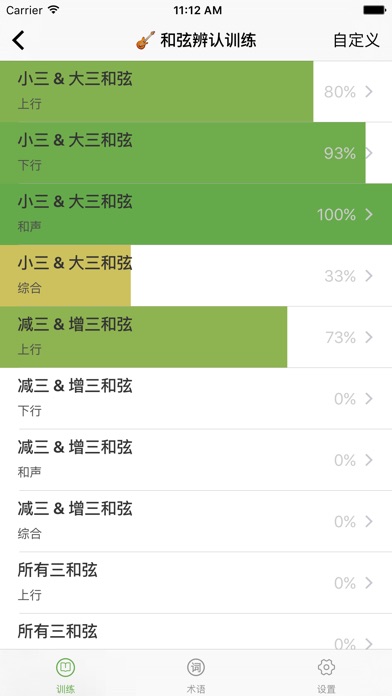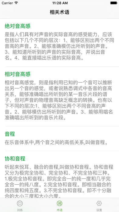 【简约而有效的练耳视唱APP】 练耳视唱、音乐入门及艺考升必备应用 应用主要提供五大类练耳训练课程: 1.绝对音高训练 2.音程比较训练 3.音程辨认训练 4.和弦辨认训练 5.和弦转位训练 【特色】 1.每大类的课程除了提供预设训练课程外,可根据自己的实际需要选择自定义训练项目。满足不同的练耳需求。 2.每项训练提供统计成绩,每大类的课程提供课程完成度参考值。让你对自己的训练情况实时把握。 3.提供相关参考术语,让零基础的用户也能快速使用。 4.可更换播放声音的音色,目前支持:原声钢琴、酒吧钢琴、羽管琴、音乐盒、原声吉他、竖琴、西塔琴七种音色。 课程介绍: 【绝对音高训练】(约39个训练) 主要训练对单音的辨识能力和定位能力。预设课程从C大调的大三和弦开始,涵盖了从无升降号的C大调到eb旋律小调,36个大小调的单音听辨课程。允许用户自定义不同的单音进行针对性训练。 【音程比较训练】(约48个训练) 主要训练对音程大小的辨识能力。预设课程提供从同度到八度内13种音程比较训练,每个比较训练包含:分解上行、分解下行、和声、综合四种子训练,涵盖实际音乐的不同演示方式。允许用户自定义不同的音程比较训练。 【 音程辨认训练】(约36个训练) 主要训练对不同音程的辨识能力。预设课程提供从同度到八度内13种音程的辨识训练,每个辨识训练包含:分解上行、分解下行、和声、综合四种子训练,涵盖实际音乐的不同演示方式。允许用户自定义不同的音程辨识训练。 【和弦辨认训练】(约29个训练) 主要训练对不同和弦的辨识能力。预设课程提供从大三和弦到增大七和弦11中和弦的辨识训练,每个辨识训练包含:分解上行、分解下行、和声、综合四种子训练,涵盖实际音乐的不同演示方式。允许用户自定义不同和弦进行辨识训练。 【和弦转位训练】(约44个训练) 主要训练对和弦不同转位的辨识能力。预设课程提供不同的三和弦和七和弦的转位识别训练,每个辨识训练包含:分解上行、分解下行、和声、综合四种子训练,涵盖实际音乐的不同演示方式。允许用户自定义不同和弦的转位进行针对性训练。 祝你的艺考和音乐之路学有所成,一帆风顺! 商业合作合作或批量购买请联系QQ512343931。