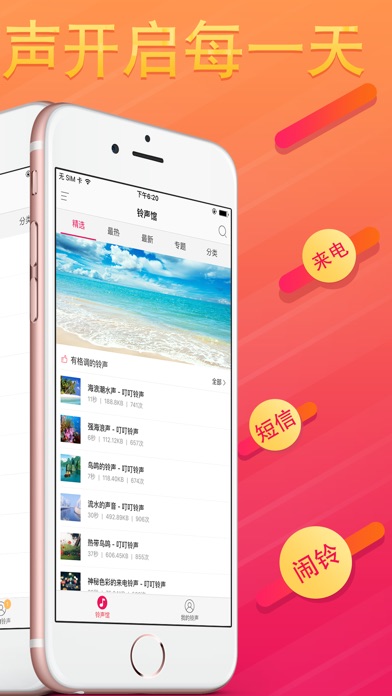 精选20多类,5万多+首好听的,搞笑的,好玩的铃声,你肯定能找到自己喜欢的手机铃声,可以设置成电话,短信和闹钟铃声,让自己的爱机“动听”起来~ 让您铃声更动听: 1. 每日推荐铃声:小编每天为您精选好多好听的铃声,铃声完全免费哦; 2. 最被人喜欢的热门铃声:可以看到每天,每周,每月大家都喜欢什么铃声; 3. 铃声专题:小编会经常把好玩的铃声做成专题,这样找起来就更方便啦; 4. 铃声分类:提供了包含短信铃声,搞笑幽默,儿童铃声,欧美,日韩铃声等近20个分类,让喜欢探索的你找到更多好听的铃声; 5. 零广告,烦人弹窗一个不留; 6. 本地管理:下载过的可以轻松管理;