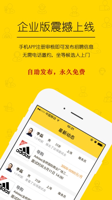 找工作、做兼职,就用“同城招聘网” ———专注基层岗位,美差招聘旗下值得信赖的招聘品牌! 涵盖全职、兼职、实习生。同城招聘网,以“入职快、职位多、信息真、没中介“等特点,已赢得了数百万求职者的信任,帮助到50万候选人找到称心的工作。现已开通全国主要城市。 产品特点: 【更快速】全国首创面试会形式,无需简历、一键报名、直接面试,一天就能找到好工作。 【更丰富】覆盖全国30个城市,每周30万场面试会,涵盖全职、兼职、实习生。 【更真实】所有信息100%人工审核,真实可靠,消灭黑中介和虚假信息。 【更透明】工资高不高?工作累不累?打开“雇主点评”,一搜就知道。 全职、兼职、实习生,求职、招聘、找工作,就上同城招聘网! 联系我们: 同城招聘网全国找工作热线:400-00-52711 同城招聘网找工作群:512454617 同城招聘网兼职群:535438018 【招聘企业】 只需要上传营业执照并通过审核之后,即可以永久免费发布招聘信息。