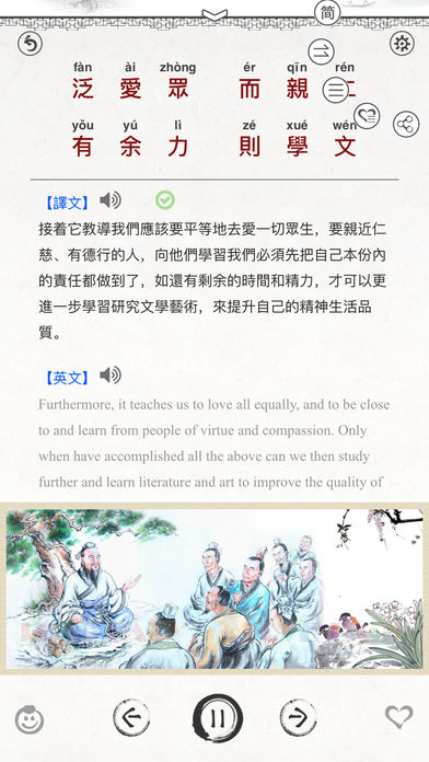 学国学,知礼仪、识大体、长见识、会感恩、懂谦虚、提素质、讲担当! 领略国学魅力,弘扬传统文化。国学的智慧,是中国人生存发展的精神动力和文化源泉。应由更多的家长、老师、学生…共同发扬分享。 这一系列的国学APP,有专业的国学开发团队制作:配有专业语音、专业插图、专业解析!是国学复兴必备软件! ◎功能特点: 1、纯净无广告,支持iPhone / iPad 等任何苹果设备和任何版本的iOS系统。 2、图文并茂,高清、精美的诗意插图,更易学习与理解。 3、 拼音长按可隐藏,排版合理,中国风界面,赏心悦目。 4、名师朗诵诗词,可选儿童朗读,译文也带语音。专业好听,字幕同步。支持离线听读。对儿童早教特别有帮助。 5、 励志故事:为了能更好地学习这部文化经典,特别提炼了《弟子规》中的人物典故 “90个励志小故事”。 6、 注释、译文、启示、赏析与详解、英文翻译、简体/繁体 7、 屏幕取词:每个汉字或词语都可选中进入词典(中文解释/英文翻译) 8、 背景音乐为国学古典音乐,贴切主题,听国学时感觉美妙无比。 9、 随心收藏,快速找到自己喜欢的诗词。 10、 支持后台播放、单首诗词循环播放。走到哪、听到哪、看到哪。 11、 单个播放或者循环播放;所有内容(包括收藏夹)循环播放。 做最适合学习的国学启蒙软件,引领大众“简单学国学”。 《弟子规》(原名《训蒙文》)是中国传统的启蒙教材之一,作者是清朝康熙年间的秀才李毓秀。后经贾存仁修订改编而成为弟子规。其内容采用《论语》“学而篇”第六条“弟子入则孝,出则弟,谨而信,泛爱众,而亲仁,行有余力,则以学文。”的文义,列述弟子在家、出外、待人、接物与学习上应该恪守的守则规范。 《弟子规》共有360句、1080个字,三字一句,两句一韵,和仄押韵,朗朗上口;全篇先为《总叙》,然后分为《入则孝》、《出则弟》、《谨》、《信》、《泛爱众》、《亲仁》和《余力学文》七个部分。 《弟子规》集孔孟等圣贤的道德教育之大成,提传统道德教育著作之纲领,是接受伦理道德教育、养成有德有才之人的最佳读物。 有问题可随时联系我们: 邮箱:angellixf@foxmail.com 网站:http://blog.sina.com.cn/angellixf 您的满意是我们的追求,您的肯定是我们的动力,如果您喜欢本软件,请给我们好评,谢谢!