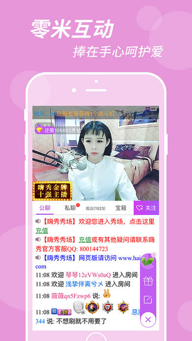全新的直播平台,高清的视频画面,绚丽的动画特效,丰富的互动形式,给你夜店酒吧的极致体验 这里有男神女神、专业模特、性感舞者,想不想跟他们做朋友? 万人直播间一起嗨秒拍体验现场亲密互动! 嗨秀秀场就是你追求激情和狂野的大party,快来加入我们吧。 来交友:面对面劲爆畅聊 主播真人视频聊天 从此告别寂寞 来互动: 送礼物,玩游戏,秀座驾,主播与你一起嗨到底