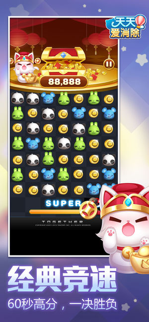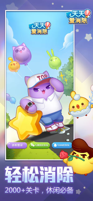 《天天爱消除》国民级超萌的消除手游,4亿玩家都爱玩! 游戏以换位三连消除为基础玩法,4大玩法模式,60余种元素设计,超过1800多个关卡设计,更有各形各色可爱萌宠供你选择。完成任务,点亮成就,丰厚奖励等你领取。和好朋友一起玩,消除一下,好运一年,畅爽根本停不下来! 基本玩法: 找出3只相同的小动物,让他们手拉手排一起,就会“咻-”的一下消除哦。 游戏特色: 【冒险闯关 百变玩法】 冒险大地图,无限新玩法等你来挑战。新增【跳过此关】功能,妈妈再也不用担心我卡关了!过关后抵押的星星会返还哦。 【周赛挑战 塔防+消除】 爱消除隆重推出全新塔防周赛,清新童真森林主题,塔防加消除玩法,加倍的输出…