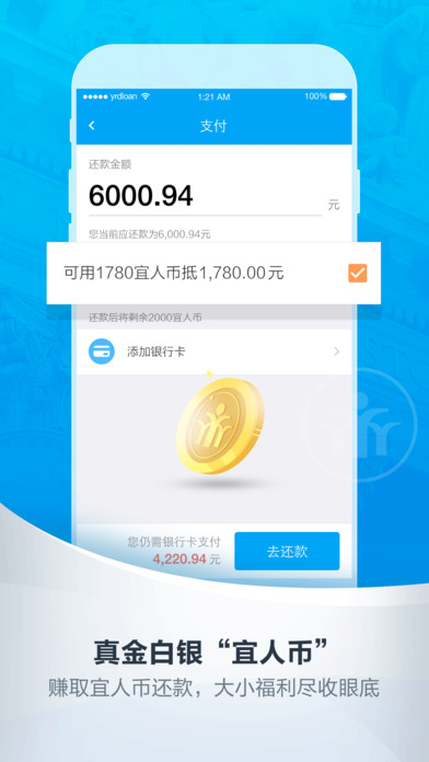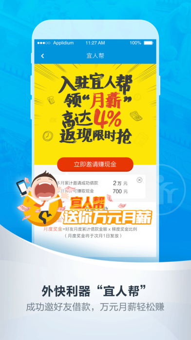 宜人贷借款新体验,30分钟极速到账20万。 【产品简介】 “宜人贷借款极速版”专注极速借款,流程简单,闪电到账,是为有急用钱需求的用户量身打造的极速借款产品。使用App借款只需要填写基本信息,就可以查询借款额度。通过新增人脸识别功能,保证借款流程安全可靠。通过补充个人资料,即可获得更高额度、更低费率。本产品是宜人贷极速模式产品的全面优化升级,借款体验更畅快! 【宜人贷介绍】 宜人贷是2012年由全球成交量最大的P2P公司宜信推出的个人对个人信用借款与理财咨询服务平台。宜人贷秉持“让信用变价值”的理念,依托宜信9年风控经验,采用反欺诈系统交叉验证,及移动互联网和大数据创新技术风控,坚持科技驱动金融创新,领航移动互联网金融布局,为大众信用价值的建立、释放和传递搭建了一个轻松、便捷、安全、透明的网络平台。 【宜信介绍】 宜信公司创建于2006年,总部位于北京。目前已经在182个城市(含香港)和62个农村地区建立起强大的全国协同服务网络,通过大数据金融云、物联网和其他金融创新科技,为客户提供全方位、个性化的普惠金融与财富管理服务。2010年4月,国际顶级创业投资机构KPCB对宜信进行了千万美元级的战略投资(KPCB曾投资谷歌、亚马逊、美国在线等企业)。2011年,IDG资本和摩根士丹利亚洲投资基金(MSPEA)与宜信公司达成战略合作。这两家机构携手2010年初加入宜信的KPCB,联合向宜信注资数千万美元,并将它们在过去数十年投资金融与高科技等行业、帮助不同阶段企业成长的成功经验带进宜信,助力普惠信用和财富管理在中国的发展。2014年12月,宜信公司当选“北京市网贷行业协会”会长单位, CEO唐宁当选为协会会长。2015年1月,宜信公司当选“中国小额贷款公司协会”副会长单位。同时宜信还是中国人民银行指导下,中国支付清算协会互联网金融专业委员会副主任委员单位。