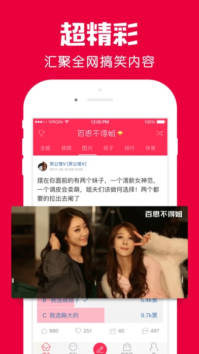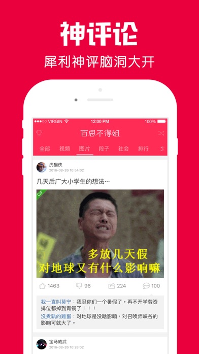 ——百思不得姐,最搞笑的手机App—— 年度最好玩的搞笑内容平台,整个互联网能嗨翻宇宙的神级脑洞大神段子手们都在这.. 最新鲜的视频,最爆笑的段子,最有趣的GIF囧图,承包所有你无聊的时间。 更有“姐夫”们毁天灭地“神评论”,花式吐槽,脑洞大开,人人都是段子手…… 【打发无聊的神器】从此没有你不知道的梗!各路奇趣汇聚,一键分享,引爆朋友圈! 【大神云集】各路女神、内涵大师齐聚,给你最嗨的世界,记得点关注哦! 【人人段子手】各种神评论,脑洞大无穷 --网友评价--- “这是一个有节操有三观APP,在幽默与诙谐之后隐藏的是此处无声胜有声的无奈,在刻薄搞怪的嘲弄中隐藏的尽是温情”---伏羲伏羲我是黄河 “断断续续用了好些年了,每天打开手机第一件事看微信,然后就是百思不得姐,形成习惯了。现在内容越来越丰富了,乏味的生活也靠她来调剂了”----#23000 “很多精彩内容 睡前乐一下”---网友傻气侧漏 “真的很好玩,媲美知乎天涯专为年轻人打造的脑洞大开的地”---幸福小火嘚。 --关于我们--- 1、加入我们的用户QQ群: 239726002 2、还可以关注我们微信:百思不得姐 3、请关注我们的官方微博@百思不得姐,了解更多产品与活动信息
