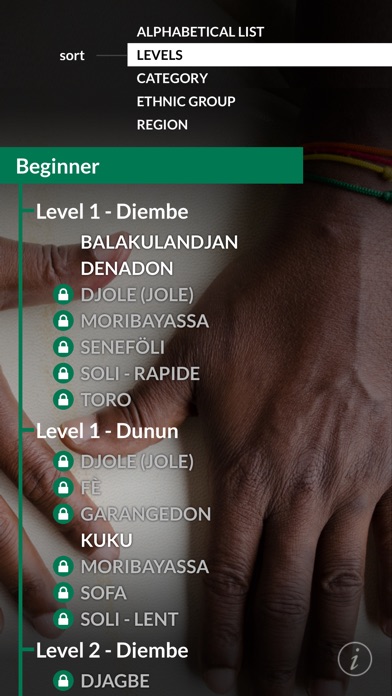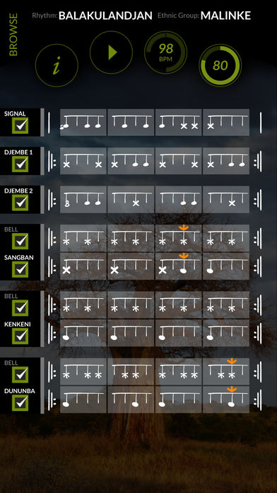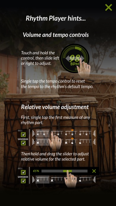 About djembefola! Inspired by Master Djembeföla, Mamady Keïta, and designed for students and enthusiasts worldwide, djembeföla! is the most comprehensive West African drumming app available today. Scroll through dozens of traditional rhythms, each with djembe and dunun parts, using sorting options such as Region, Ethnic Group, Cultural Purpose, and more. Press play and following the djembe signal, the selected rhythm plays in a continuous loop, as the cursor visually marks each beat. With master tempo and volume controls, as well as separate volume sliders and mute buttons for each djembe and dunun part (including the dunun bells) djembefola! is infinitely customizable. Press the 'i' (info) button for more in-depth information about the rhythm -- information that is vital to the preservation of West African drumming culture. Play it through headphones for individual woodshedding, or through a home stereo or PA system via WiFi or BlueTooth to play as a group. Set the sorting function to 'LEVELS' and djembeföla! is uniquely set up to follow TamTam Mandingue Djembe Academy's curriculum for certification. With links to TTMDA and ClubTTM, djembeföla! is the perfect tool to help you achieve your TTMDA certification. In-app purchases mean you can go at your own pace -- start with the Beginner Levels Module, and when you're ready, explore the Intermediate and Advanced Modules. There's even a Dununba Rhythms Module with fifteen Dununba Rhythms, and future modules will include original rhythms created by Mamady Keïta. Features: • over 60 rhythms available in Version 1.0 • multiple sorting groups - alphabetical, ethnic group, region, purpose, and TTM curriculum levels • actual recordings instead of samples - means it sounds organic and authentic instead of computer-generated. • single page interface - you don't have to switch pages to view the notation, or change the mix. • master tempo control - slide left or right for .75x to 1.5x the rhythm's default tempo, and simply tap the control to return the tempo to the rhythm's default value. • individual mute and volume controls - emphasize whichever parts you want to hear more clearly. • in-app purchases - build your library of rhythms as you go, with available rhythm packs from Beginner to Advanced, and more • links to TTMDA and ClubTTM - one of the world's most in-depth resources for West African drumming culture, the TTMDA site lists all kinds of drumming events and workshops, as well as links to TTMDA Certified Teachers all over the world. There's an online store, and with ClubTTM, there are countless hours of video posted by both Mamady Keïta and TTM Certified Teachers.