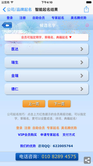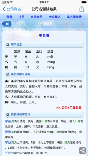 美名腾智能公司起名网是智能起名理念的开创者和领导者,让一个公司名字尽可能多的满足全方位的信息,使得名字更具文化内涵和时尚元素。可以完美满足公司所在领域特征、五格数理、诗词、成语、《周易》、《诗经》等古典元素。公司起名系统目前包含49个大领域,45,372个子领域;根据用户的心愿起名;形,音,意灵活变换;完美体现五格数理,数理大吉。美名腾公司起名工具是公司起名的集大成者。除了公司起名软件外,本软件还包括:公司测名,法人生辰八字查询,择吉万年历,公司起名字典,公司起名资讯等实用内容。 美名腾智能起名的优势: 1)独创六度空间起名法,传统和现代完美结合; 2)《诗经》、《楚辞》、《周易》、《论语》…
