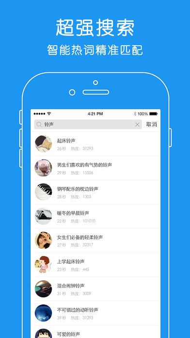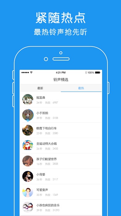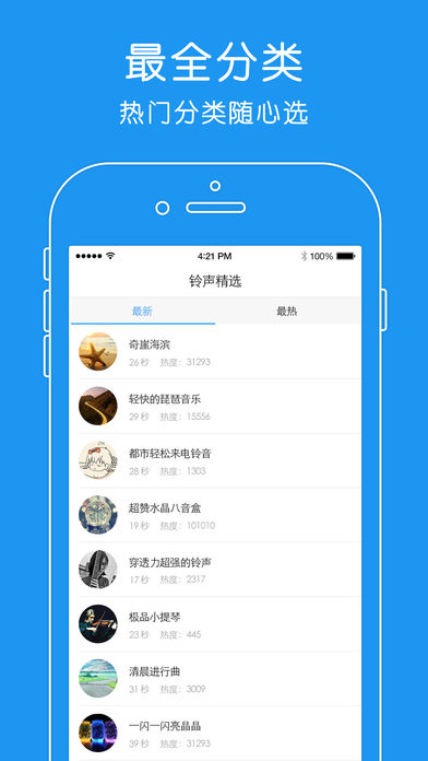 超过300,000首高品质铃声,真正的海量铃声全球首发 天天更新,首首精彩,专属铃声随心淘,再也不用担心跟别人撞铃了 功能简介: 1、最全的高品质铃声库,海量铃声任你选 2、紧随热点,时下最火的歌曲铃声,全都不会错过 3、 影视、轻音乐、动漫、搞笑等各类铃声随你挑 4、每天实时更新,最新铃声抢先听 5、最全分类,清晰明确,保证您可以快速定位自己的爱好,找到自己想要的那一首 6、智能搜索功能,更有热词精准匹配 7、轻轻一点,快速试听 8、问题反馈功能,有问题或建议欢迎随时反馈 此乃打造您专属爱机的必备应用,千万不要错过哦!