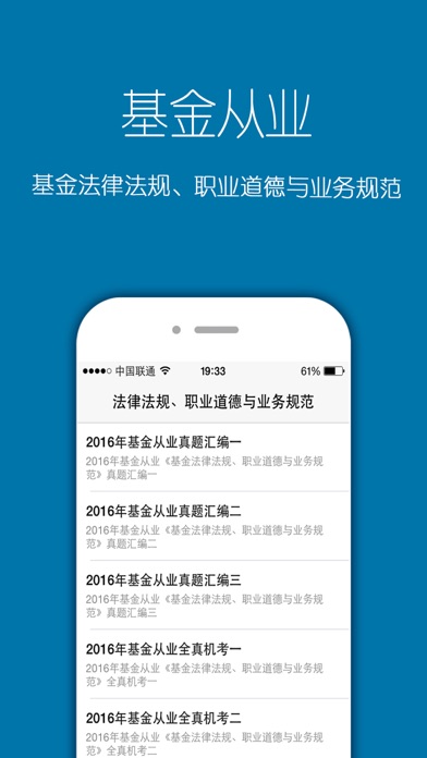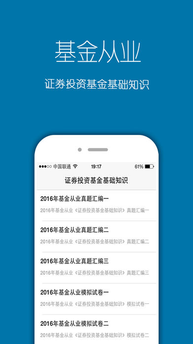 《基金从业资格考试》 应用介绍: 针对基金从业资格考试所制定的专业辅导软件,为从业考试学员提供证券投资基金,基金法律法规的题库。 真题解析——历年真题解析,押题好伴侣 离线使用--无广告,无需网络,方便便捷。 股权投资基金基础知识 2016年基金从业《股权投资基金基础知识》预测试卷一 2016年基金从业《股权投资基金基础知识》预测试卷二 2016年基金从业《股权投资基金基础知识》预测试卷三 法律法规 2016年基金从业《基金法律法规、职业道德与业务规范》真题汇编一 2016年基金从业《基金法律法规、职业道德与业务规范》真题汇编二 2016年基金从业《基金法律法规、职业道德与业务规范》真题汇编三 2016年基金从业《基金法律法规、职业道德与业务规范》全真机考一 2016年基金从业《基金法律法规、职业道德与业务规范》全真机考二 2016年基金从业《基金法律法规、职业道德与业务规范》模拟试卷(1) 2016年基金从业《基金法律法规、职业道德与业务规范》模拟试卷(2) 2016年基金从业《基金法律法规、职业道德与业务规范》模拟试卷(3) 2016年基金从业《基金法律法规、职业道德与业务规范》模拟试卷(4) 2016年基金从业《基金法律法规、职业道德与业务规范》模拟试卷(5) 2016年基金从业《基金法律法规、职业道德与业务规范》模拟试卷(6) 2016年基金从业《基金法律法规》提分冲刺试卷一 2016年基金从业《基金法律法规》提分冲刺试卷二 2016年基金从业《基金法律法规》提分冲刺试卷三 2016年基金从业《基金法律法规、职业道德与业务规范》机考押题试卷(1) 2016年基金从业《基金法律法规、职业道德与业务规范》机考押题试卷(2) 2016年基金从业《基金法律法规、职业道德与业务规范》机考押题试卷(3) 2016年基金从业《基金法律法规、职业道德与业务规范》机考押题试卷(4) 2016年基金从业《基金法律法规、职业道德与业务规范》预测试卷一 2016年基金从业《基金法律法规、职业道德与业务规范》预测试卷二 2016年基金从业《基金法律法规、职业道德与业务规范》预测试卷三 。。。。。 基础知识 2016年基金从业《证券投资基金基础知识》真题汇编一 2016年基金从业《证券投资基金基础知识》真题汇编二 2016年基金从业《证券投资基金基础知识》真题汇编三 2016年基金从业《证券投资基金基础知识》模拟试卷一 2016年基金从业《证券投资基金基础知识》模拟试卷二 2016年基金从业《证券投资基金基础知识》模拟试卷三 2016年基金从业《证券投资基金基础知识》模拟试卷四 2016年基金从业《证券投资基金基础知识》模拟试卷五 2016年基金从业《证券投资基金基础知识》模拟试卷六 2016年基金从业资格《证券投资基础知识》机考押题试卷一 2016年基金从业资格《证券投资基础知识》机考押题试卷二 2016年基金从业资格《证券投资基础知识》机考押题试卷三 2016年基金从业资格《证券投资基础知识》机考押题试卷四 2016年基金从业证券投资基金基础知识测试题(1) 2016年基金从业证券投资基金基础知识测试题(2) 2016年基金从业证券投资基金基础知识测试题(3) 2016年基金从业证券投资基金基础知识测试题(4) 。。。。。。。