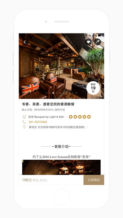 描述: 约了么Yueleme ——约一顿有调调的饭,enjoy精选轻奢美食 约了么是一款全民高档餐厅预订服务工具,通过约了么,你可以随时掌握城中精英餐厅的最新动向,无伦是无敌江景,历史外滩,上海滩之巅,奢华酒店还是深藏在美术馆、音乐厅、博物馆、画廊、酒窖的餐厅统统都以最给力的价格购买他们的限量美食套餐,且可免费参与尝鲜他们的隐藏菜单和新菜,享受最优质的用餐体验。 当你想约爱人、家人、朋友、同事……或者自己去好点的地方吃顿好的时候,我们随时帮你定制一顿有档次、有品位,有爱的主题式美餐。无论是豪华酒店,花园洋房,异国风情还是时尚创新,我们有100+的方式让你爱上我们,不会让你错过那些重要的日子,并留下暖暖的回忆。 我们向用户提供: - 独家菜单:由约了么团队与精选餐厅精心打造的专享的菜单,只向约了么用户独家提供 - 免费尝鲜:第一时间品免费品尝到名厨名店的最新的当季美食菜品的机会 - 优先预订:新店、新菜单,紧俏私厨席位优先预订 - 定制服务:无伦是庆生、爱情纪念日、 闺蜜小聚、老友相见、单人静享还是亲子家庭,约了么的定制服务让你以最轻松最简单的方式计划安排那些重要的日子