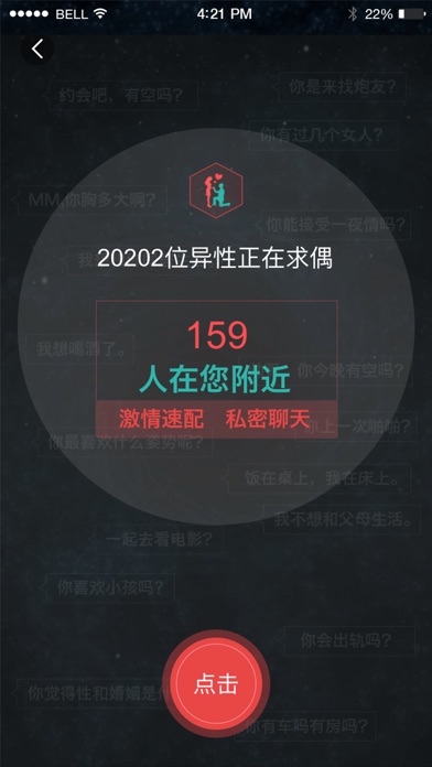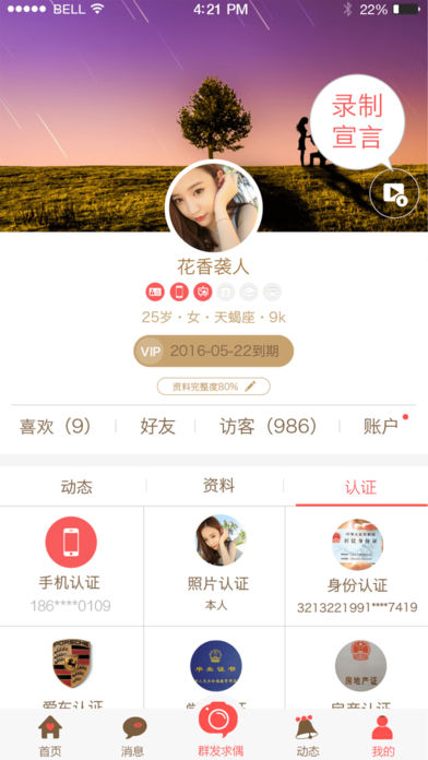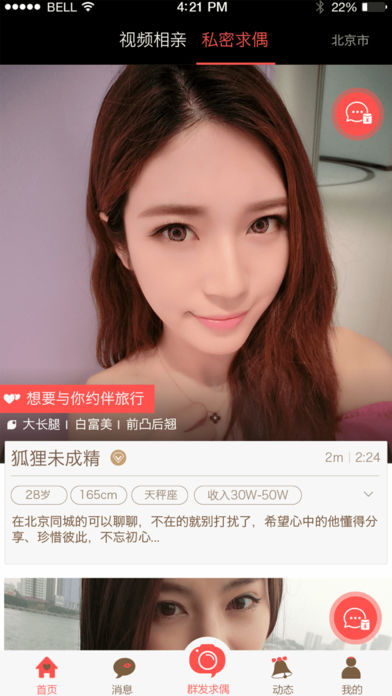 繁忙的都市里,寂寞的夜晚,是否强烈希望由异性朋友闯入你的世界,与你谈情说爱,同城约会,谈一场说走就走的恋爱,找一个温馨的情人,快速脱单,马上求偶。 求偶是专为同城单身男女打造的社交平台,这里聚集了大量都市白领,时尚丽人,在校学生,OL高素质女性,也有成功男士,社会精英,健身教练,运动达人,海归绅士,求偶让你的生活不在孤单,我单身,我自求偶,你呢? 随时随地邂逅同城异性,与有缘人线下见面相聚,开启私密约会; 满足你在百合、世纪佳缘、抱抱、遇见、珍爱、找对象、想恋爱、热恋、缘来、花田、求约会、陌陌、牵手婚恋的所有需求! 【视频征婚】真人视频征婚,让征婚变的更加真实可靠。 【一键求偶】群发交友,向附近的人快速群发交友信息。 【真实资料】学历认证,财产认证,照片认证,帮你清晰辨别真伪,杜绝酒托,婚托,真实放心交友。 【联系方式】VIP用户可以查阅用户微信好,手机号轻松与他保持紧密联系。 【附近的人】基于位置,随时随地的搭讪身边的人,让交友简单高效,帮你快速找到专属情人。 【即时聊天】喜欢上她就直接联系,语音,文字,红包各种勾搭方式,简单直接。