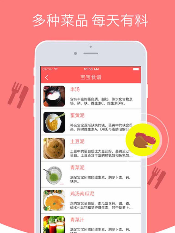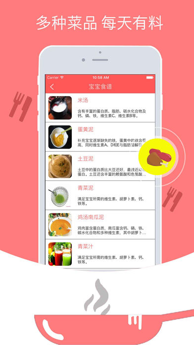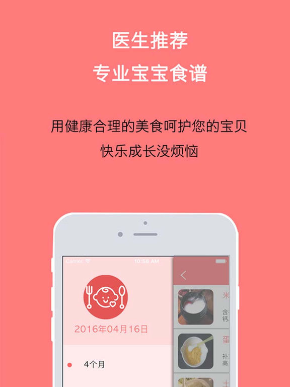 宝宝食谱 专业医生和护士推荐辅食,营养均衡更好吃! 为处在4到36个月的宝宝提供每日菜品,健康营养的饮食搭配,让宝宝健康成长没烦恼!