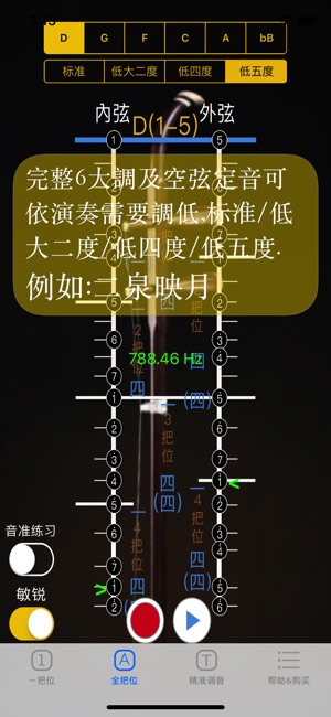 [二胡音准-不止是调音器] 简洁的使用介面, 2弦图示音准位置, 噪音过滤, 音准显示稳定, 无需任何设定, 打开APP, 拉动二胡, 自动将音准显示于画面弦上的相对应位置, 供练琴者比对自己左手按弦位置是否正确, 可以有效提升音准, 特别是音感不佳及不熟习把位的学琴者. 彻底解决, 左手按弦换把位时, 身旁没老师纠正音准的痛苦. 功能说明: [1把位分页] ▪ 空弦调音[免费] : 空弦时, 拉动二胡任一弦, 绿色三角箭头若对准空弦上蓝线位置, 即为音准, 准确度在正负25分位(cents)内. 超出范围时, 绿色三角箭头会变成红色. ▪ 即时音准反馈[免费] : 演…