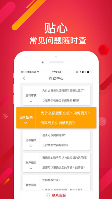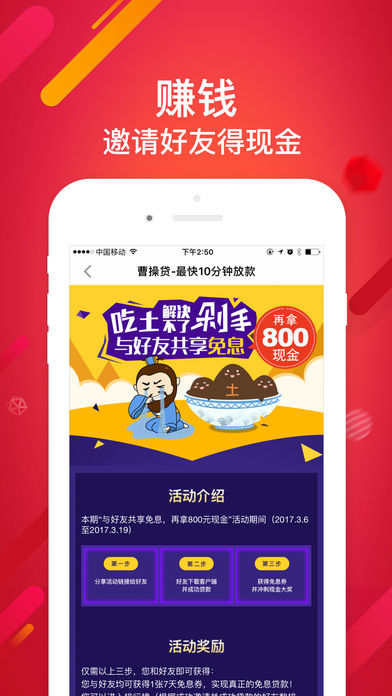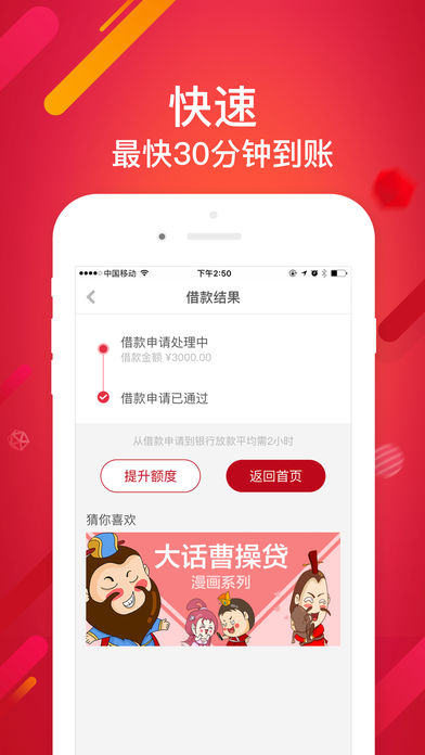 贷款找曹操,说到就到! 时逢曹操贷一周年,现在下载、注册,即有机会获得免息、现金红包、霸王贷等机会! 急用钱?工资还没发?又不好意思向父母和朋友开口借钱?马上来曹操贷!曹操贷专注为您解决应急、小额、没有信用卡、快速贷款等烦恼,3分钟在线申请,最快10分钟到账! 【产品特色】 1. 简单:无抵押、零担保,3分钟完成申请 2. 极速:纯线上机器审核,最快10分钟到账 3. 灵活:提供100-3000元、7-42天灵活借款 4. 保障:拍拍贷旗下明星产品,用专业保驾护航 【关于曹操贷】 曹操贷是拍拍贷旗下的全新借款平台,是国内领先的纯线上、零人工干预的互联网借款平台。曹操贷为借款人提供最高3000元、最短7天、最快10分钟到账的极致现金借款服务。 拍拍贷成立于2007年6月,是中国第一家P2P网络信用借贷平台,也是第一家由工商部门特批“金融信息服务”资质,并多次受到CCTV、人民网等权威媒体报道。2012年10月拍拍贷获得千万美元级别投资,2014年4月完成B轮融资,2015年4月宣布完成近亿美元C轮融资。 【联系我们】 官方客服电话:400-184-8888 官方微信公众号:caocaodainb 使用过程中,遇到任何问题,都可通过以上方式联系我们,我们会第一时间协助您处理。