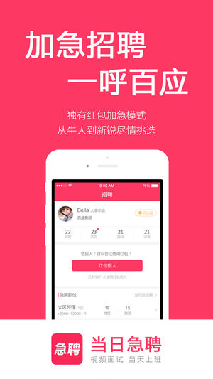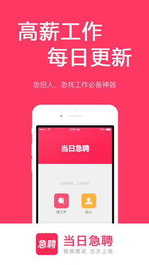 全国高薪急聘,每日更新! 招聘、求职、找工作必备神器! 【当日急聘】 覆盖全国的各大行业,真实靠谱的招聘平台,通过视频面试等方式,实现24小时极速上班! 基于地理位置,寻找附近靠谱的好工作或人才,和企业老板、直接手机面试, 最快当天上班!急招人、急找工作的必备神器! 当日急聘,重新定义手机招聘! 招聘求职找工作最新神器,老板直招,视频面试,当天上班,可以寻找同城全职或兼职、实习的工作机会! 严格监督招聘行为,让求职者找工作找得放心! 【高薪工作,每日更新】优选全国各服务业连锁品牌薪酬最高的招聘岗位,让招聘方和找工作的求职者都能看到最新更新的招聘信息 【视频面试,当天上班】手机电话、语音…