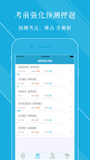 本软件为政法干警招录考试题库软件(含本科类、专科类、本硕类),《文化综合》《民法学》《申论》、《行测》等科目,结合最新考试大纲及最新考试动态、认真研究历年考试真题、综合分析最新考试信息、把握近几年考试的发展趋势,针对考试的不同题型、考点,开发了考试标准题库。题库均配有详尽的答案及解题思路。 【功能介绍】 1、2018最新押题试卷,带答案详解,并可手动将易错或未牢固掌握的题加入复习库和错题库,以便反复练习,可进行顺序测试和模拟测试。 2、历史真题:精选最新历史真题题目及解析。 3、错题库:可自动加练习过程中错题加入收藏,以便反复练习。 4、收藏夹:可在练习过程中自行收录题目到收藏夹,形成…