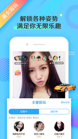 大神软妹聚集的游戏陪玩、主播开黑平台。 汇聚最新鲜有趣的游戏直播,最实力带躺的大神陪玩,最热血便捷的主播开黑,最火热激情的带妹体验!王者、吃鸡、赛事、陪玩,这里有为热爱游戏的你量身打造的一切游戏周边! 特色内容 【王者陪玩主播带躺】 一顿操作猛如虎,一看战绩零杠五?没关系的!明星主播带你一路上王者! 【吃鸡版块全新上线】 精彩直播、意识教学、赏金赛事、大神陪玩,教你从盒子精秒变鸡王! 【主播开黑一键上车】 观看直播不够劲?一键上车随心玩!老司机现场发车,就问你来不来! 【颜值陪玩带妹体验】 没人开黑太寂寞?颜值陪玩邀你嗨!你的附近正有50位小姐姐等你带飞!