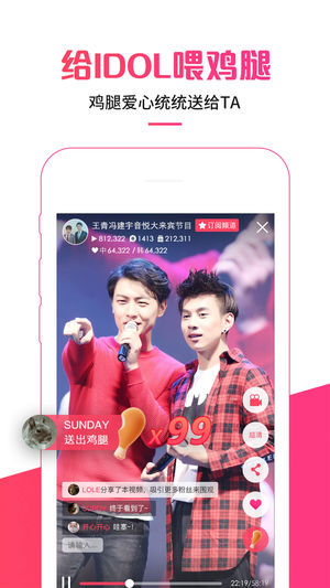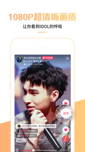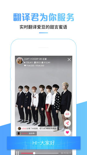 一款专注明星直播的APP,聚集时下流行当红艺人打造的全明星直播,快来与偶像有爱互动~ 【 (^o^)/~】明星直播,为粉丝呈现爱豆最好玩有趣的一面 【b( ̄▽ ̄)d】实时互动,为IDOL的精彩表演点赞,IDOL也能实时查看粉丝留言哦 【~(@^_^@)~】大量独家活动现场直播,独家福利,独家签名专辑 【(⊙▽⊙)】贴心翻译,为你实时翻译idol的甜言蜜语,不用再怕听不懂偶像说什么了 你的 鹿晗、王青、冯建宇、EXO、防弹少年团、TFBOYS、T-ara、VIXX、黄子韬、吴亦凡、张艺兴、王青、陈伟霆、Krist、Singto、晏紫东、蒋梓乐、X玖少年团、AKB48、GOT7、ACEMAX-…